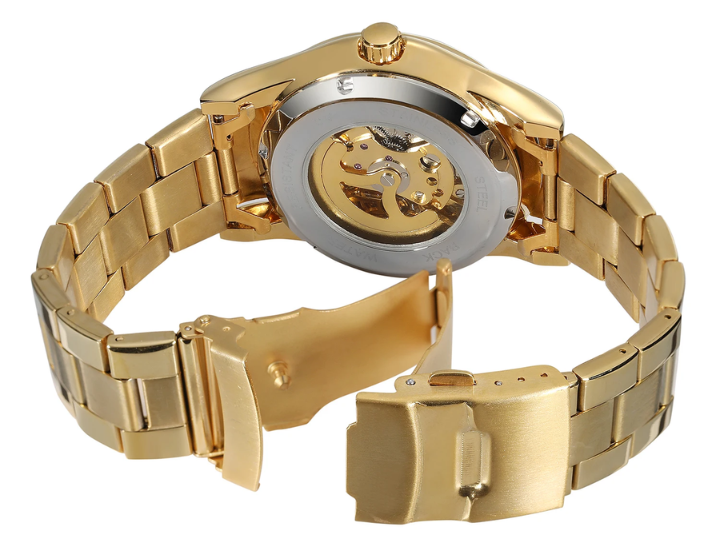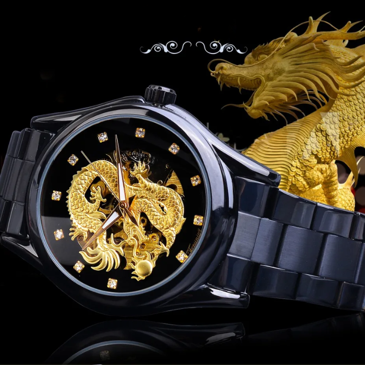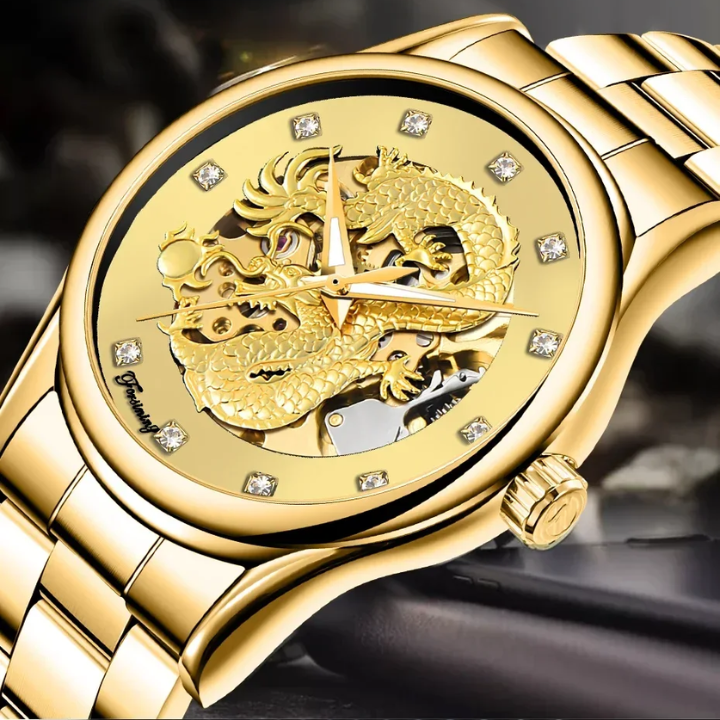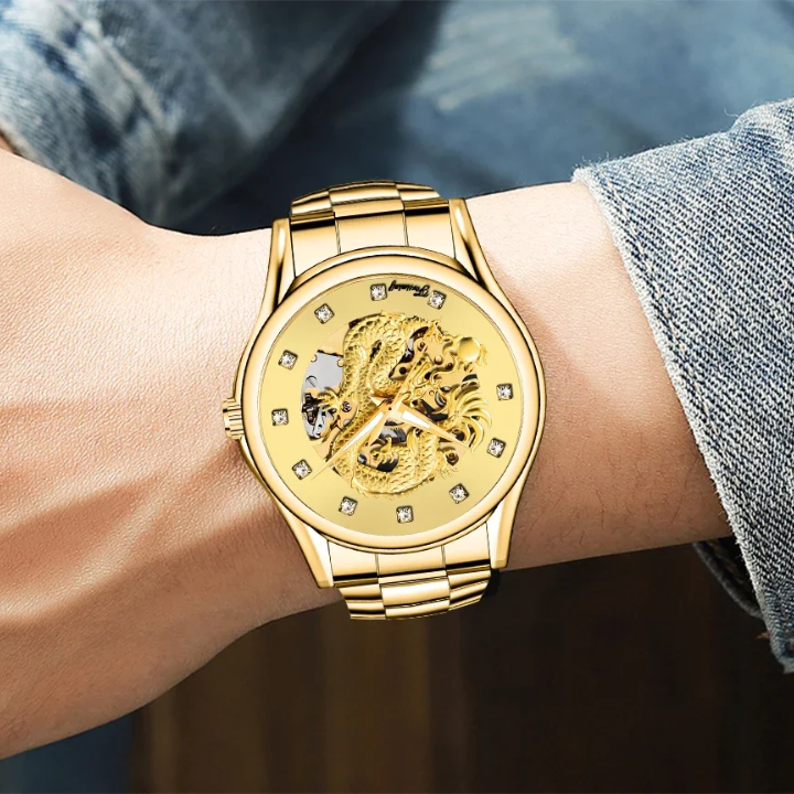 Este exclusivo reloj dorado, con un majestuoso dragón en su interior, no es solo un accesorio: es un símbolo de fuerza, poder y estilo único. Ideal para hombres seguros de sí mismos que quieren destacar en cualquier ocasión.