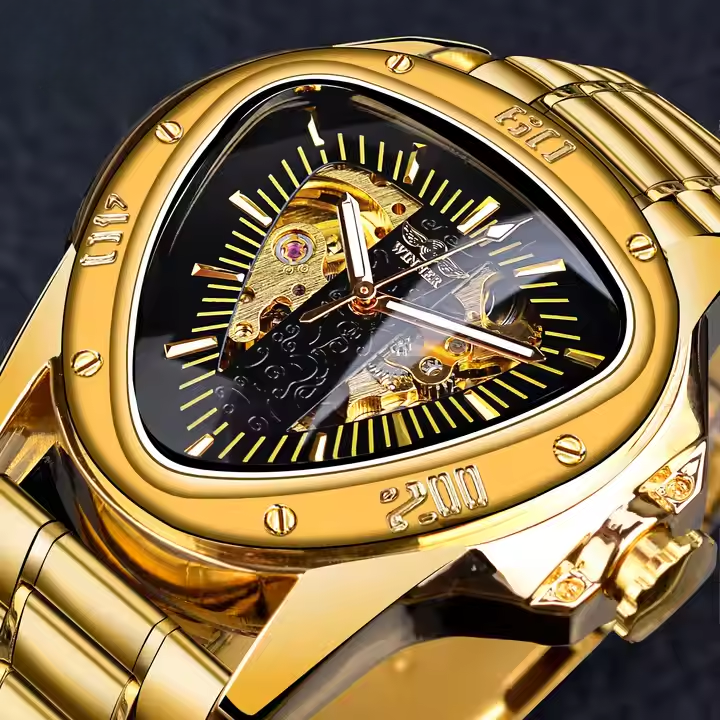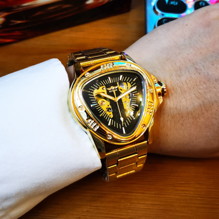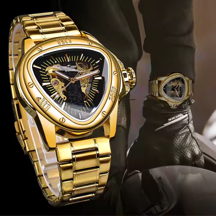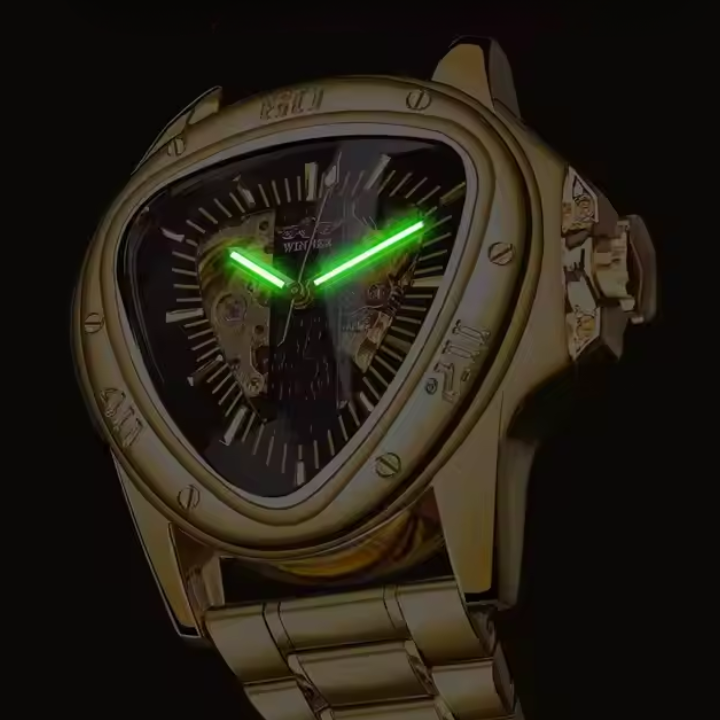 Descubre un reloj diferente a todos: este exclusivo modelo triangular combina lo mejor de la relojería mecánica con un diseño audaz y moderno. Su estructura automática, detalles dorados y caja en forma de triángulo lo convierten en un accesorio único, pensado para hombres con personalidad, estilo y determinación.